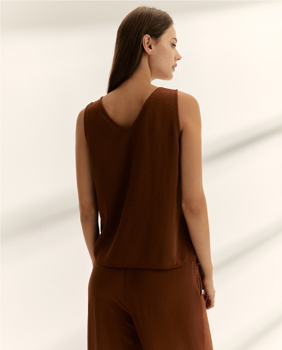 BLUSA PAZ TORRAS V26216. Blusa de mujer de cuello pico y sin mangas. Detalle de falsa abotonadura en laterales con pequeña abertura. Puedes encontrar su pantalón a conjunto. Regular fit.