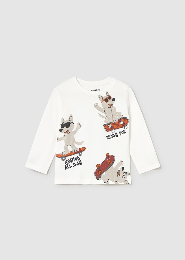 CAMISETA ML POSICIONADA M AYORAL 2061. Camiseta de manga larga para bebé. Cuello redondo. Botones a presión en el hombro para facilitar la puesta de la prenda. Elementos de adorno: serigrafía (print).