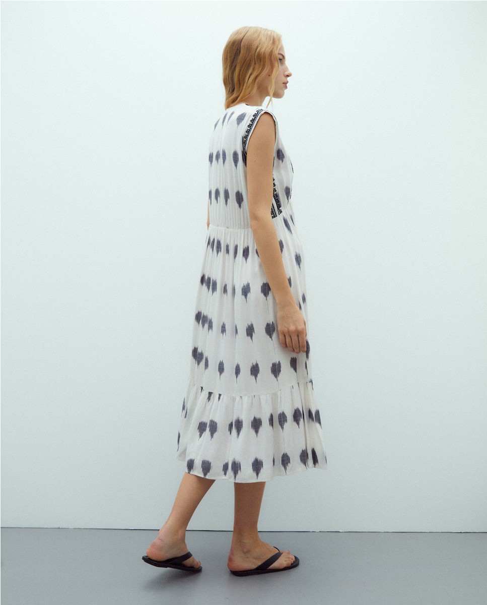 VESTIDO ANDAM 8013. Vestido midi estampado sin mangas cuello pico