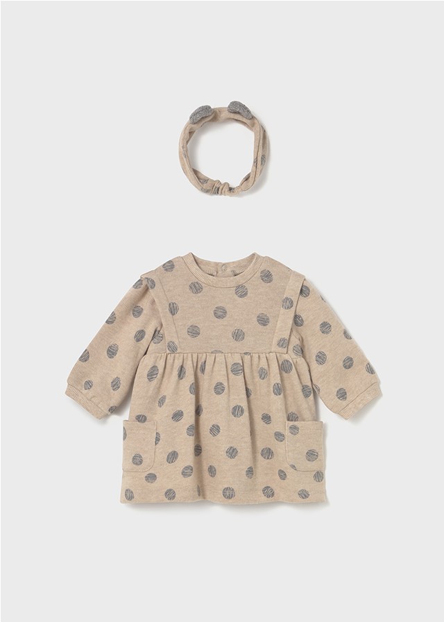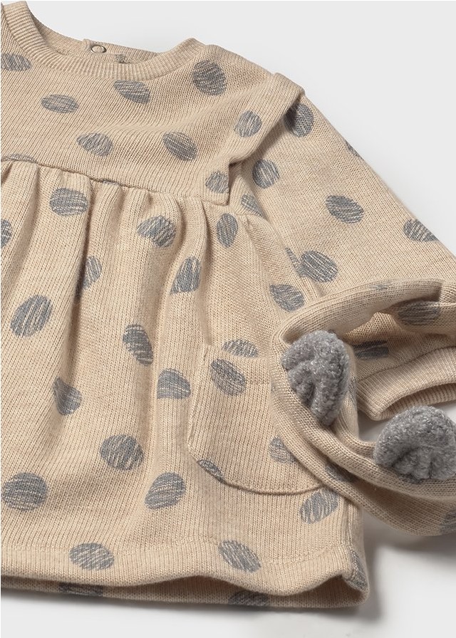 VESTIDO PUNTO TRICOT SOFT MAYORAL 2807. Vestido de manga larga para recién nacido. Cuello redondo. Cierre con botones a presión en la parte posterior. Modelo con rizo. Bolsillos en la parte delantera. Estampado de lunares.